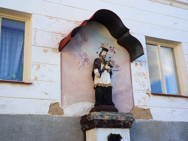 Socha světce Jana Nepomuckého na budově pošty Žihobce.