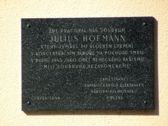 Pamětní deska na budově přečerpávací elektrárny Černé jezero s textem: "Zde pracoval náš soudruh Julius Hofmann, který zemřel po dlouhém utrpení v dubnu 1945 jako oběť německého fašismu. Milý soudruhu, nezapomeneme! Zaměstnanci západočeských elektráren národního podniku v Plzni. Červen 1946".