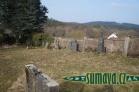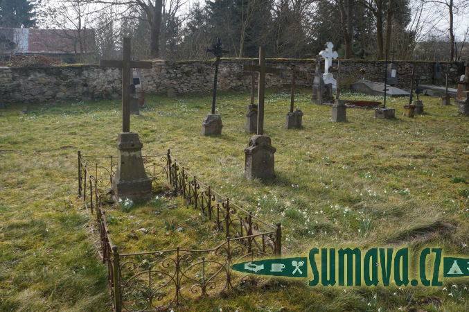 Hřbitov za kostelem Povýšení sv. Kříže v Újezde svatého kříže je obehnán neomítnutou kamennou zdí.