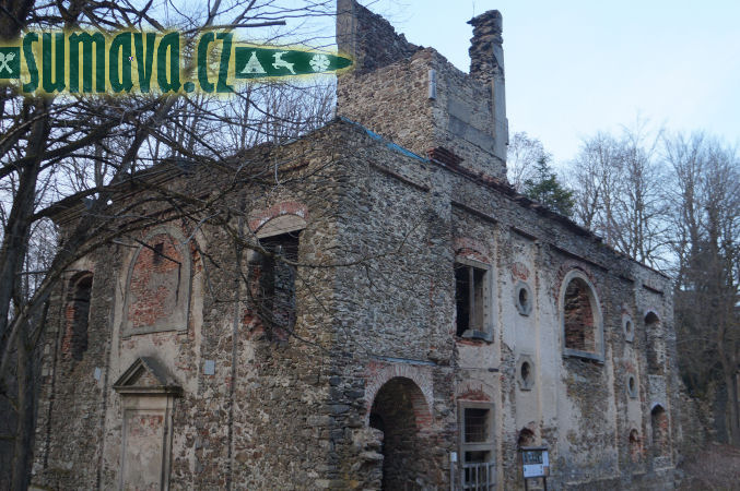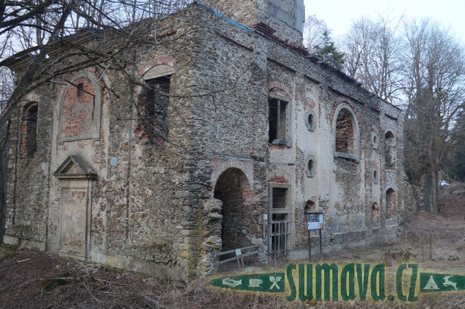 Kostel je pozůstatkem bývalé osady Apolena (Svatá Apolena), ze které bylo v roce 1945 její převážně německé obyvatelstvo vysídleno. Obec pak zanikla a do dnešní doby se z ní kromě tohoto kostela nedochovaly téměř žádné stopy. První zmínka o kapli sv. Apoleny je z r. 1580. Později když k prameni, který měl několika lidem vrátit zrak, začali mířit další nemocní, nechal tehdejší majitel panství, hrabě Georg Maximilian Lindelo, upravit pramen a postavit raně barokní kostel. Ten byl vysvěcen v roce 1670. O provoz kostela se starali dva poustevníci. V okolí stavby postupně vzniklo několik domů, ve kterých před 2. světovou válkou bydlelo téměř 40 obyvatel. To již věhlas poutního místa upadal. Od poloviny 19. století se nikomu do oprav nechtělo. Kostel byl ponechán svému osudu již na počátku 20. století tedy ještě dlouho před vysídlením obce a jeho stav tak nemá s tím nic společného. Velké mše, které zde bývaly o svatodušních svátcích, se musely od roku 1938 sloužit venku, protože hrozilo nebezpečí zřícení kostela. Již za druhé světové války byl v havarijním stavu. Vnitřní zařízení kostela bylo přemístěno do kostelů v okolí. V současné době se zdá, že je snaha alespoň zachovat jeho zbytky. Kostel má z vnějšku obdélný půdorys, vnitřní prostor zaujímá pak půdorys kříže s centrálním prostorem s kupolovou klenbou. Na střední prostor navazoval po východní straně užší pravoúhlý presbytář s vydělenými nárožními čtvercovými prostorami. Severní měla funkci sakristie, jižní pak jako komora. V patrech pak byly oratoře, šneková schodiště k nim vedoucí byla vestavěna do přilehlých pilířů. Na západní straně navazoval na ústřední prostor podobně o něco užší prostor před kůrem s postranními čtvercovými kaplovými prostorami s emporami v patře, otevírajícími se do lodi půlkruhově ukončenou arkádou. V západním konci kostela byla vstupní předsíň, nad ní v patře trojdílná kruchta, podkruchtí odděleno od lodi plnou zdí s portálem. Kdysi valbová střecha krytá šindelem, dnes již neexistuje. Zdivo je z místního lomového kamene, případně žuly ojediněle bylo použito cihel. Presbytář, loď, sakristie a oratoře byly pravděpodobně sklenuty valenou klenbou s lunetami, podkruchtí, kaple a empory klenbou křížovou. Roku 2007 byla jeho zřícenina prohlášena za kulturní památku.