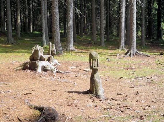Dřevěné sochy částečně z pařezů na okraji lesa nad obcí Kvilda - Vilémov.