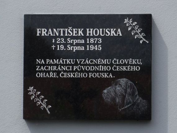 Pamětní deska na zdi hřbitova v Hošticích u Volyně s textem: „František Houska - Na památku vzácnému člověku, zachránci původního českého ohaře, Českého fouska.“