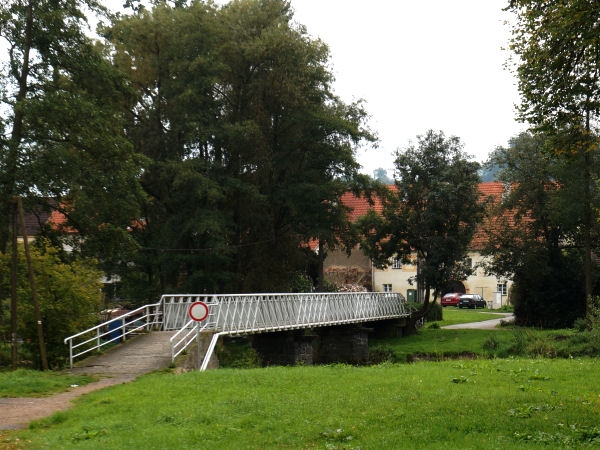 Lávka pro pěší přes Lomnici v Miroticích. Vede přes ni Ašlova naučná stezka.