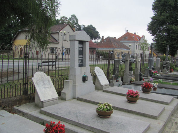 Hrob vojáků Rudé armády na městském hřbitově v Nové Bystřici s textem: "VÁM PODĚKOVÁNÍ A LÁSKU VÁM. Padlým příslušníkům Rudé armády vděční občané Nové Bystřice. Gardový kapitán Alexandr Ivanovič Cholzin z Moskvy. Ml. sezřant Ilja Vasiljevič Nikitin z Poměstnoje.
